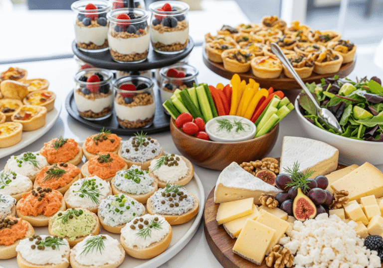 בראנצ’ בוקר בייגלים טריים, ממרחים, סלטים קלילים וקינוח קטן אמהות שמחפשות ארוחה קלה ומרעננת